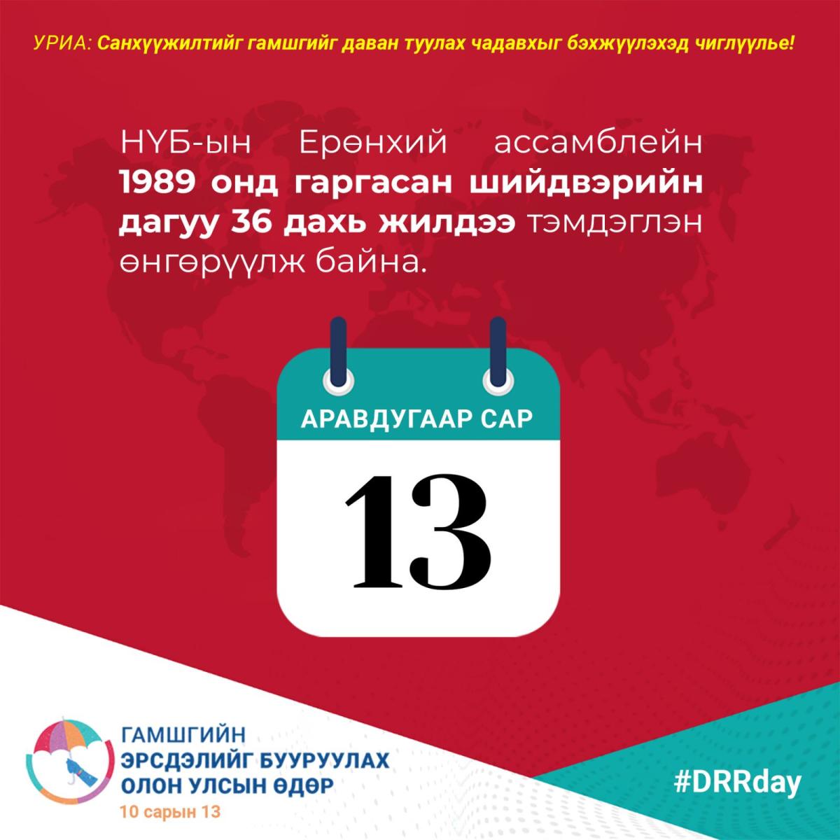 Өнөөдөр буюу 10 дугаар сарын 13. Гамшгийн эрсдэлийг бууруулах олон улсын өдөр. Энэхүү өдрийг НҮБ-ын Ерөнхий ассамблейн шийдвэриийн дагуу 1989 оноос хойш 36 дахь жилдээ тэмдэглэн өнгөрүүлж байна.