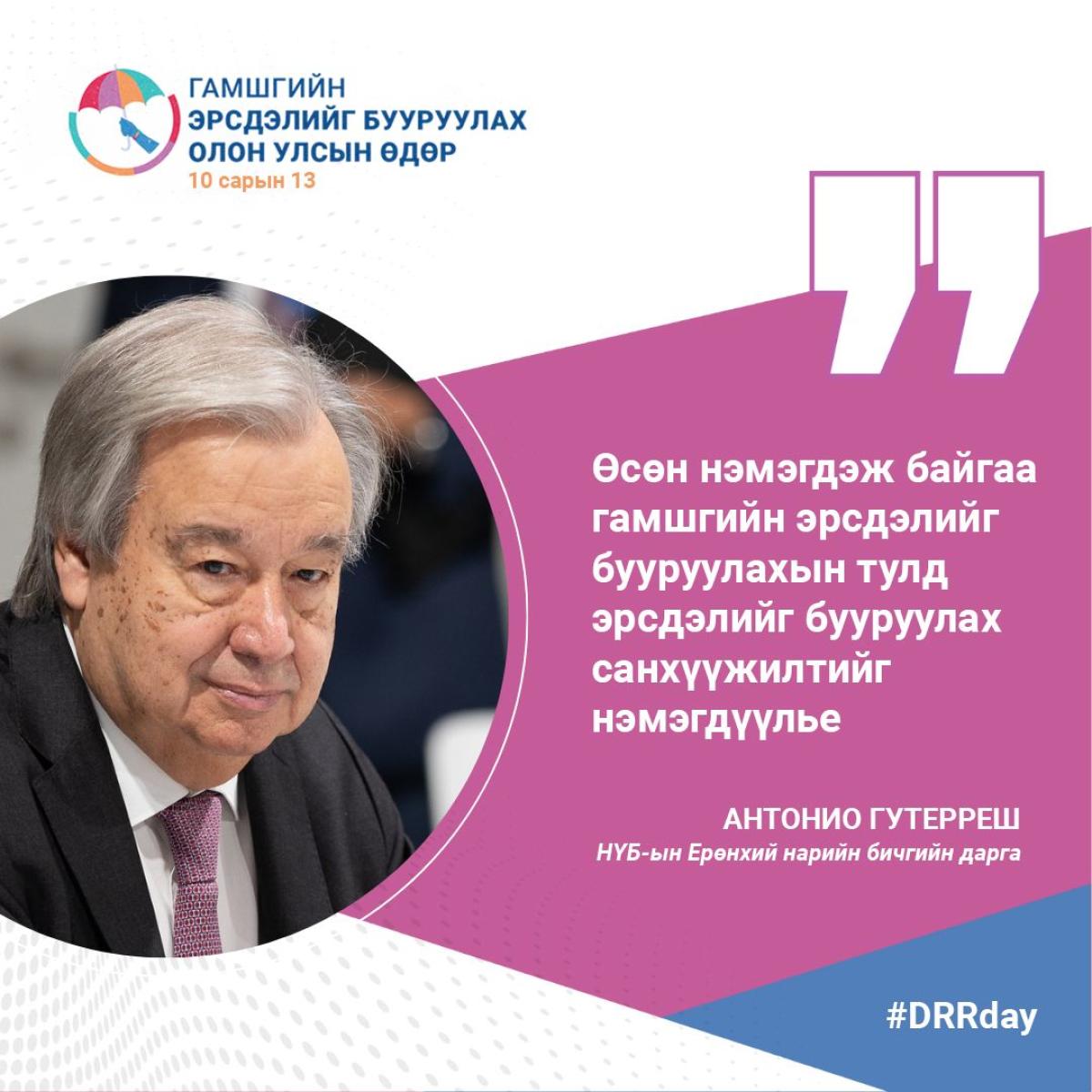 Тиймээс НҮБ-ын Ерөнхий нарийн бичгийн дарга Антонио Гутерреш “Өсөн нэмэгдэж байгаа гамшгийн эрсдэлийг бууруулахын тулд эрсдэлийг бууруулах санхүүжилтийг нэмэгдүүлье” хэмээн улс орнуудыг уриаллаа.