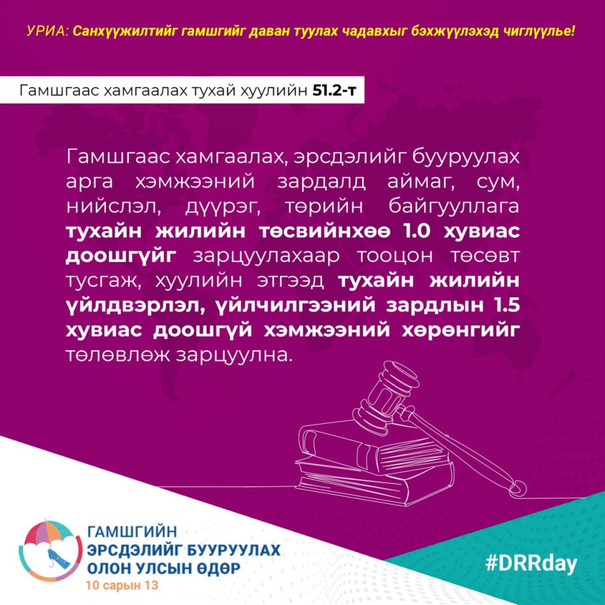 Тухайлбал, Гамшгаас хамгаалах тухай хуулийн 7.1-т Засаг захиргаа, нутаг дэвсгэрийн нэгж, төрийн болон нутгийн захиргааны байгууллага, хуулийн этгээд нь өмчийн хэлбэрийг үл харгалзан гамшгийн эрсдэлийн ерөнхий болон нарийвчилсан үнэлгээ хийхээр заасан бол 51.2-т Гамшгаас хамгаалах, эрсдэлийг бууруулах арга хэмжээний зардалд аймаг, сум, нийслэл, дүүрэг, төрийн байгууллага тухайн жилийн төсвийнхөө 1.0 хувиас доошгүйг зарцуулахаар тооцон төсөвт тусгаж, хуулийн этгээд тухайн жилийн үйлдвэрлэл, үйлчилгээний зардлын 1.5 хувиас доошгүй хэмжээний хөрөнгийг төлөвлөж зарцуулахаар тусгаад байна.