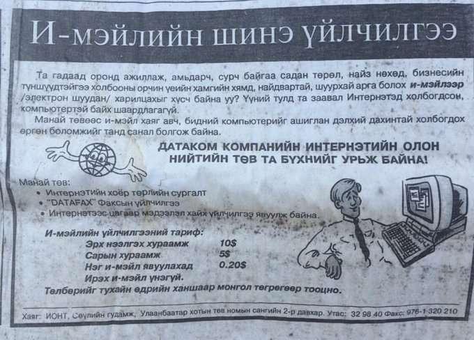 Суурин утастай таницахтай зэрэгцэн Монгол Улс интернэтийн сүлжээнд холбогдсон Азийн 10 орны нэг болж байж. Одоогоос 31 жилийн өмнө буюу 1994 оноос имэйлийн үйлчилгээг нэвтрүүлснээр эхэлж, 1996 оны нэгдүгээр сарын 17-ны өдрөөс 24 цагийн сүлжээнд холбогдсон байна. Энэ түүхийг “Датаком” ХХК нэвтрүүлж, интернэтийн үйлчилгээ үзүүлэгч (ISP) болсон гэдгийг хүүхэд байсан би тухайн үед хэрхэн гадарлах билээ.